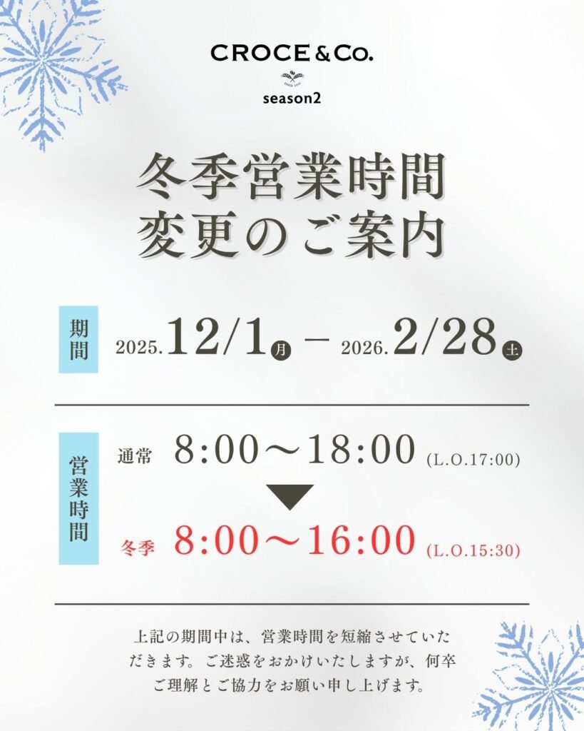 CROCE season2【冬季営業時間変更のご案内】 2025年11月24日season2、お知らせ いつもCROCE season 2をご愛顧いただき、 誠にありがとうございます😊 寒さが本格化するにあたり、誠に勝手ながら 下記の期間、営業時間を短縮させていただきます。 期間中、お客様にはご不便をおかけしますが ご理解とご協力をお願い申し上げます。 【短縮期間】 📅2025.12.1(月)〜 2026.2.28(土) 【冬季営業時間】 ⏰ 8:00 〜 16:00(L.O.15:30)