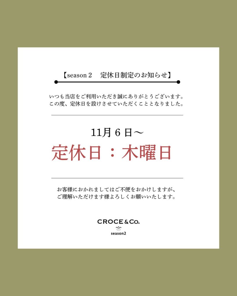 CROCE season2~定休日制定のお知らせ~ 2025年10月1日season2、お知らせ CROCE season2 定休日制定のお知らせ いつもCROCE season 2をご利用いただき、誠にありがとうございます。 2025年11月6日より、定休日を設けさせていただくことになりました。 お客様にはご不便をおかけいたしますが、何卒ご理解賜りますようお願い申し上げます。 【変更開始日】2025.11.6(木)~ 【新定休日】毎週木曜日 ※営業時間の変更はございません